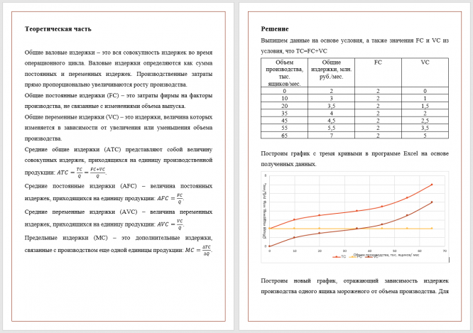 Фирма «Лакомка» решает начать производство мороженого на своей технологической линии. При этом согласно предварительному анализу издержки фирмы, включающие нормальную прибыль, будут изменяться в зависимости от объема производства следующим образом: Объем производства, тыс. ящиков/ мес.      0     10     20    35      45       55       65 Общие издержки, млн руб./мес.       2     3     3,5     4      4,5      5,5        7 Постройте кривую общих валовых издержек производства мороженого фирмы «Лакомка» в зависимости от ежемесячного объема производства, отложив на горизонтальной оси объем, а на вертикальной – издержки. На базе имеющихся данных на этом же графике (график 1) постройте кривые общих постоянных и общих переменных издержек производства (всего на графике 1 должны быть три кривые).