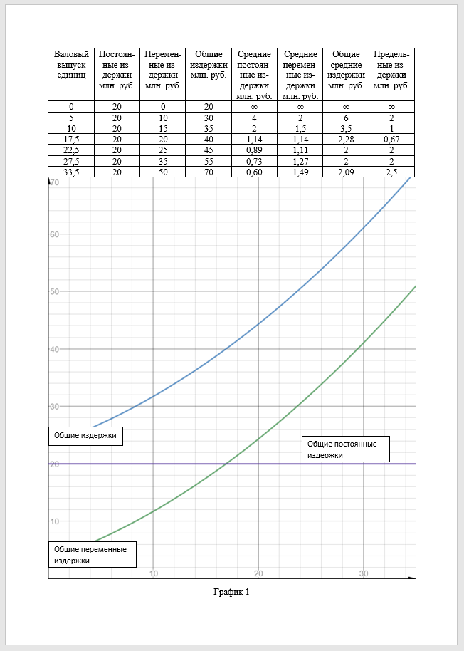 Предприятие «Химия» решает освоить выпуск стираль­ного порошка с использованием своего технологического обо­рудования. Экономистами завода было установлено, что из­держки предприятия, включающие нормальную прибыль, будут колебаться в зависимости от объема производства следующим образом:  Постройте кривую общих валовых издержек производства стирального порошка предприятием «Химия» в зависимости от годового объема производства, отложив на горизонтальной оси объем, а на вертикальной - издержки. На базе имеющихся данных на этом же графике (график 1) постройте кривые общих постоянных и общих переменных издержек производства (всего на графике 1 должны быть три кривые)..