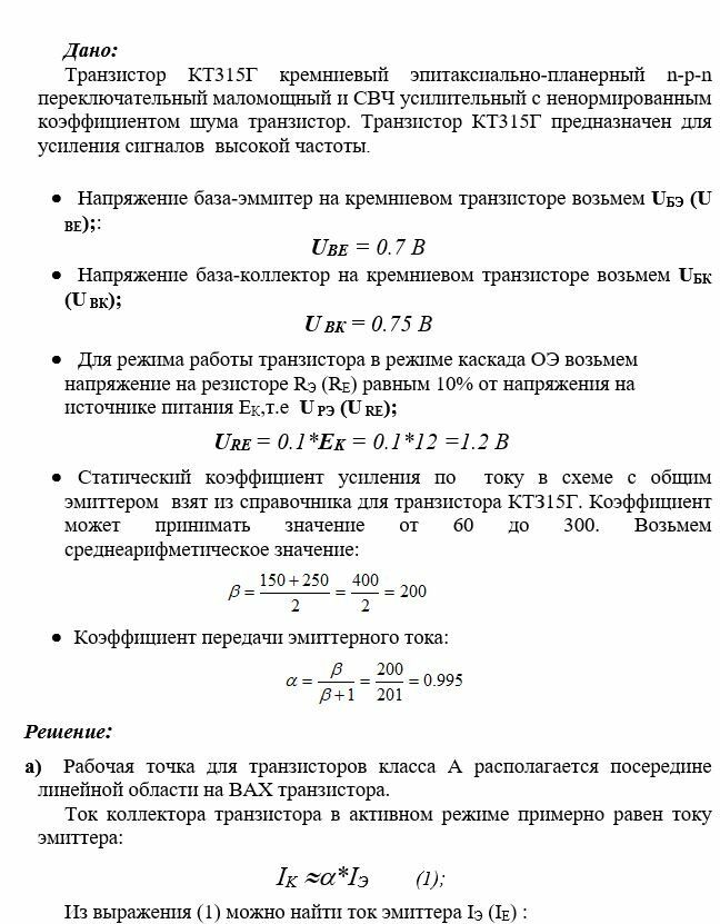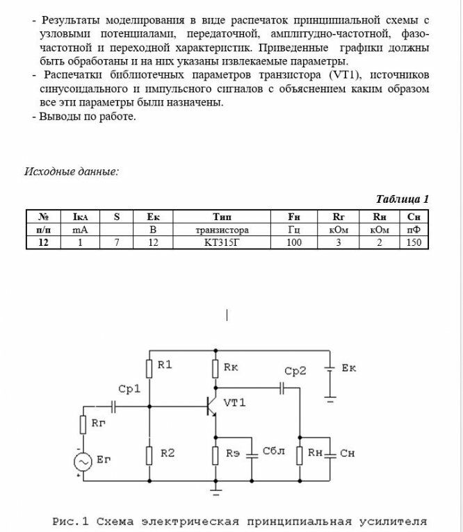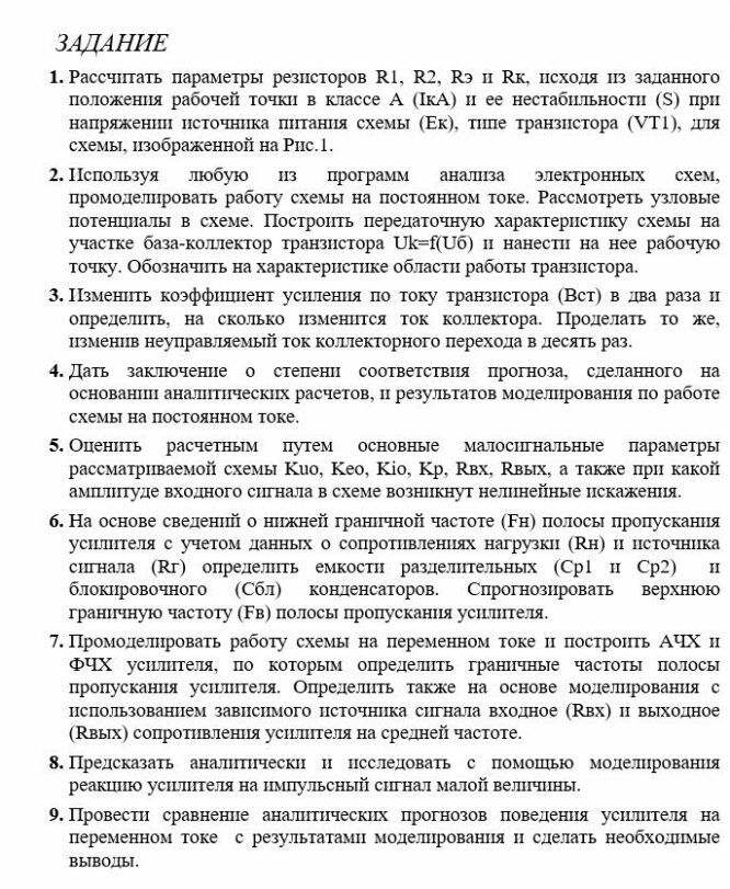 - Рассчитать параметры резисторов R1, R2, Rэ и Rк, исходя из заданного положения рабочей точки в классе А (IкА) и ее нестабильности (S) при напряжении источника питания схемы (Ек), типе транзистора (VT1), для схемы, изображенной на Рис.1.