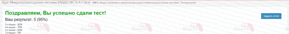 Для студентов ИДДО НИУ «МЭИ» по предмету Микропроцессорные системы (МПС)Курс Микропроцессорные системы - КМ-1. Общие сведения о микропроцессорах и микропроцессорных системах. Тестирование - 95%Курс Микропроцессорные системы - КМ-1. Общие сведения о микропроцессорах и микропроцессорных системах. Тестирование - 95%