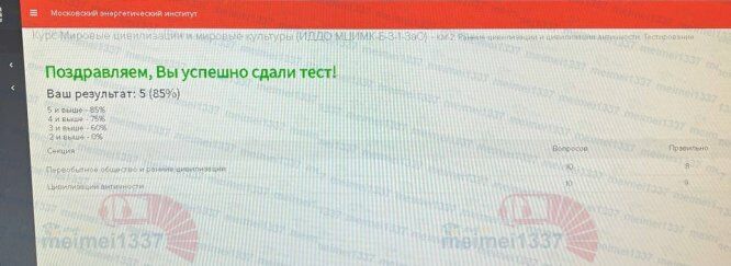 Для студентов ИДДО НИУ «МЭИ» по предмету Мировые цивилизации и мировые культурыКМ-2. Ранние цивилизации и цивилизации античности. Тестирование - 85%КМ-2. Ранние цивилизации и цивилизации античности. Тестирование - 85%