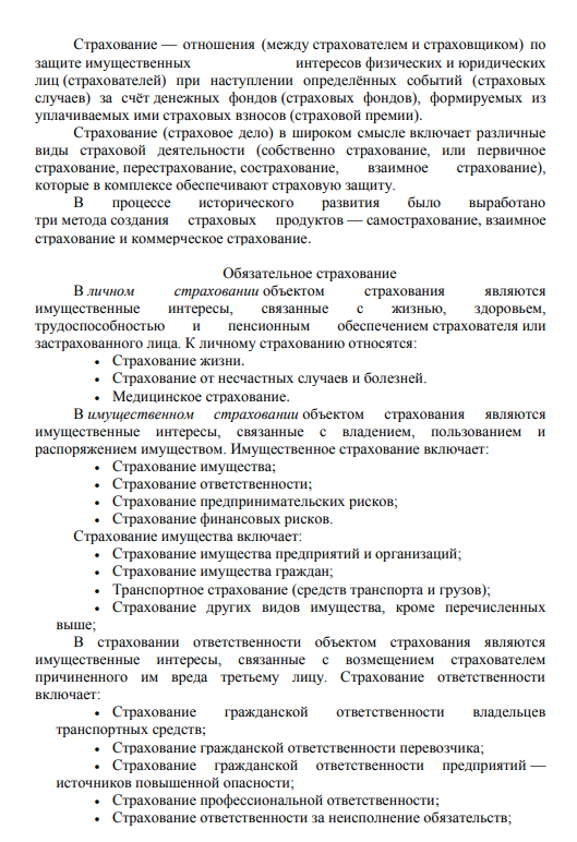 Страхование — отношения (между страхователем и страховщиком) по защите имущественных интересов физических и юридических лиц (страхователей) при наступлении определённых событий (страховых случаев) за счёт денежных фондов (страховых фондов), формируемых из уплачиваемых ими страховых взносов (страховой премии). Страхование (страховое дело) в широком смысле включает различные виды страховой деятельности (собственно страхование, или первичное страхование, перестрахование, сострахование, взаимное страхование), которые в комплексе обеспечивают страховую защиту. В процессе исторического развития было выработано три метода создания страховых продуктов — самострахование, взаимное страхование и коммерческое страхование.