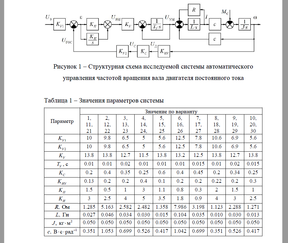 Показать/скрыть дополнительное описаниеПрактическая работа №4. Аналитическое и численное математическое моделирование системы автоматического управления двигателем постоянного тока Задачи: 1) построить передаточные функции исследуемой системы, описывающие связь входного воздействия с сигналами, заданными по варианту в Таблице 2; 2) построить графики переходных процессов в исследуемой системе при единичном ступенчатом входном воздействии и нулевом моменте сопротивления вращению на основе найденных передаточных функций; 3) записать математическую модель исследуемой системы в пространстве состояний; 4) решить записанную систему уравнений методом Эйлера для нулевых начальных условий и единичного ступенчатого входного воздействия; 5) построить графики переходных процессов, полученных численным решением модели в пространстве состояний; 6) убедиться в правильности проведенных расчетов, сравнив полученные двумя способами графики переходных процессов; 7) задать функции входного воздействия и момента сопротивления вращению от времени, обеспечивающие возможность моделирования работы системы при сбросе-набросе нагрузки, при запуске двигателя в прямом и реверсивном направлении; 8) решить систему уравнений методом Эйлера для нулевых начальных условий и заданных функций входного воздействия и момента сопротивления вращению; 9) построить графики изменения тока и частоты вращения вала двигателя; 10) оформить отчет в соответствии со стандартами ТПУ..