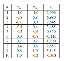 По экспериментальным данным, представленным в таблице, построить регрессионную модель, описывающей влияние двух факторов 1 x и 2 x на выход y . Вычислить информационную матрицу, матрицу дисперсий ковариаций и МНК оценки коэффициентов регрессионной модели.