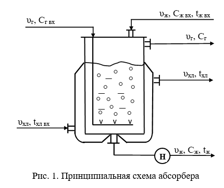 Концентрация компонента в газовой смеси С1 – характеризует количество компонента в газовой смеси, отражает назначение и цель функционирования аппарата, концентрация в абсорбенте С2 - характеризует количество компонента в абсорбенте, температура абсорбента t2 - характеризует температуру абсорбента, температура хладагента в рубашке tхл - характеризует температуру хладагента.