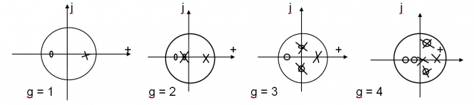 Определить порядок идентифицируемого объекта по диаграммам полюсов и нулей дискретных передаточных функций моделей различного порядка, приведенным на рисунке и обосновать решение: (о - нуль; x - полюс)