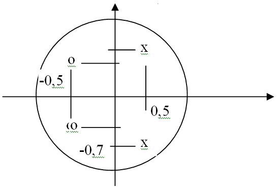 Записать выражение дискретной передаточной функции объекта с коэффициентом усиления, равным 10, по значениям полюсов и нулей, представленным на диаграмме(x – полюс, о – нуль).