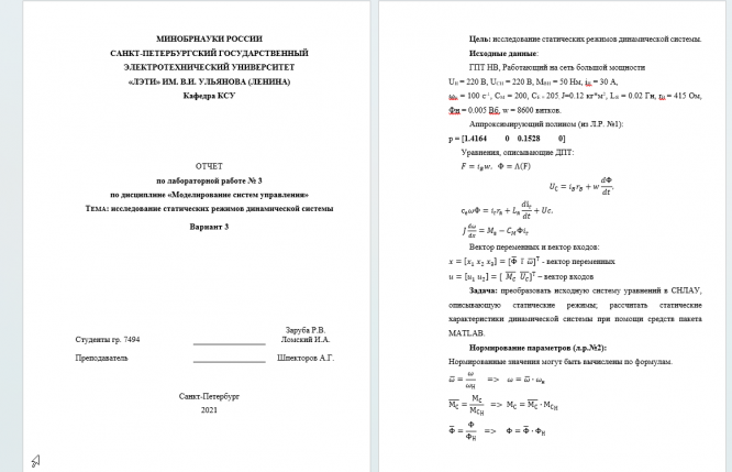 Для студентов СПбГЭТУ им. Ульянова (Ленина) по предмету Моделирование системИсследование статических режимов динамической системыИсследование статических режимов динамической системы