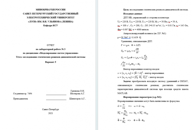 Для студентов СПбГЭТУ им. Ульянова (Ленина) по предмету Моделирование системисследование статических режимов динамической системыисследование статических режимов динамической системы