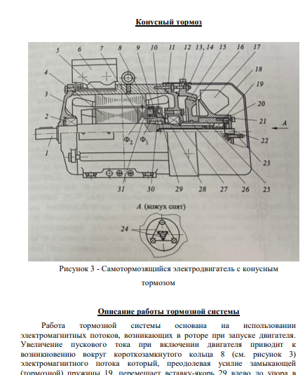 Работа тормозной системы основана на использовании электромагнитных потоков, возникающих в роторе при запуске двигателя. Увеличение пускового тока при включении двигателя приводит к возникновению вокруг короткозамкнутого кольца 8 (см. рисунок 3) электромагнитного потока который, преодолевая усилие замыкающей (тормозной) пружины 19, перемещает вставку-якорь 29 влево до упора в торец дополнительной части 31 ротора. При этом вставка-якорь по шлицевому соединению 26 увлекает за собой (через штифт 9, тягу 22, крышку 20, вентилятор 17), сжимая пружину 19, тормозной диск 16. Двигатель растормаживается.
