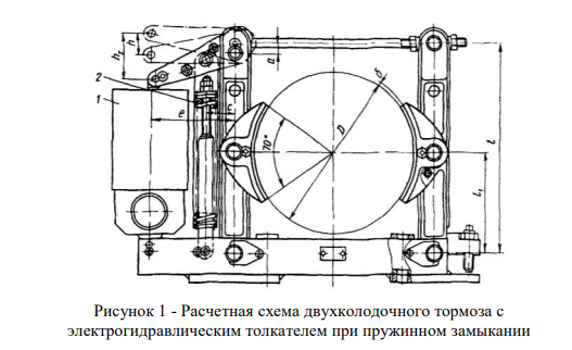 Регулировка колодочного тормоза заключается в регулировке пружину, установке равномерного отхода колодки нормального хода штока и толкателя. Для того чтобы сделать установку нормального хода штока толкателя нужно установить шток гидротолкателя в верхнее крайнее положение, далее опустить его на величину, приведенную в таблице выше (столбец t1) и в данном положении нужно зафиксировать рычаги с помощью гаек штока.