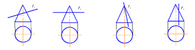 Проекции элементов определителя конической поверхности общего вида изображены на чертеже