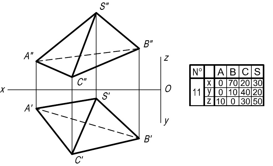• Задача 2. Построить проекции пирамиды SABC при условии, что её высота равна 80 мм, а вершина S принадлежит прямой ЕР. Решить без преобразования чертежа.