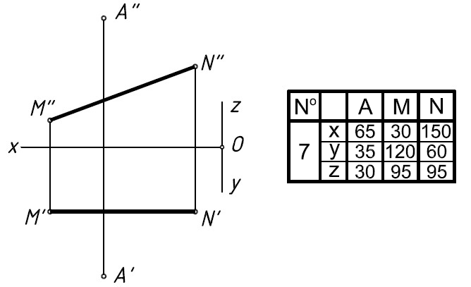 • Задача 1. Построить проекции равностороннего треугольника АВС со стороной ВС на прямой MN. Определить углы наклона высоты и плоскости треугольника к плоскостям проекций.