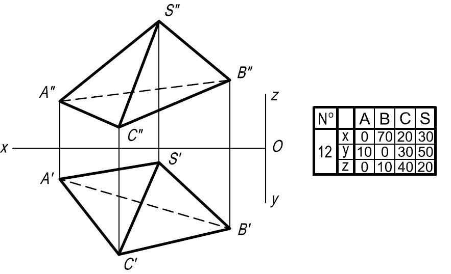 • Задача 2. Построить проекции пирамиды SABC при условии, что её высота равна 80 мм, а вершина S принадлежит прямой ЕР. Решить без преобразования чертежа.