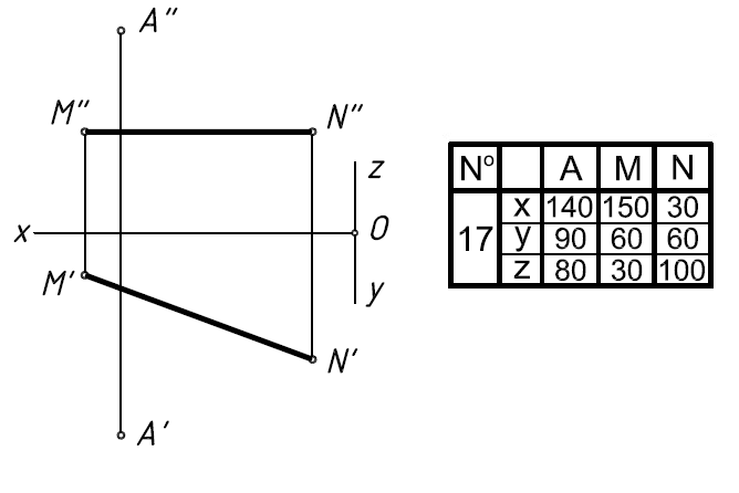 • Задача 1. Построить проекции равностороннего треугольника АВС со стороной ВС на прямой MN. Определить углы наклона высоты и плоскости треугольника к плоскостям проекций.