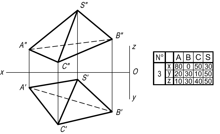 • Задача 2. Построить проекции пирамиды SABC при условии, что её высота равна 80 мм, а вершина S принадлежит прямой ЕР. Решить без преобразования чертежа.