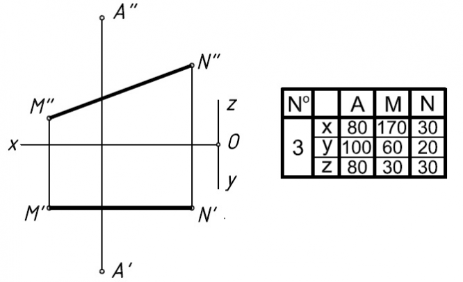 • Задача 1. Построить проекции равностороннего треугольника АВС со стороной ВС на прямой MN. Определить углы наклона высоты и плоскости треугольника к плоскостям проекций.
