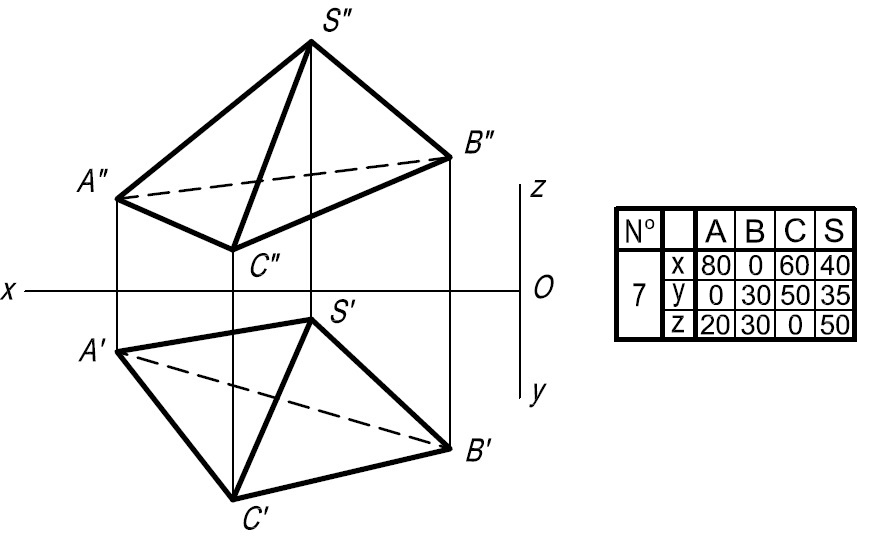 • Задача 2. Построить проекции пирамиды SABC при условии, что её высота равна 80 мм, а вершина S принадлежит прямой ЕР. Решить без преобразования чертежа.