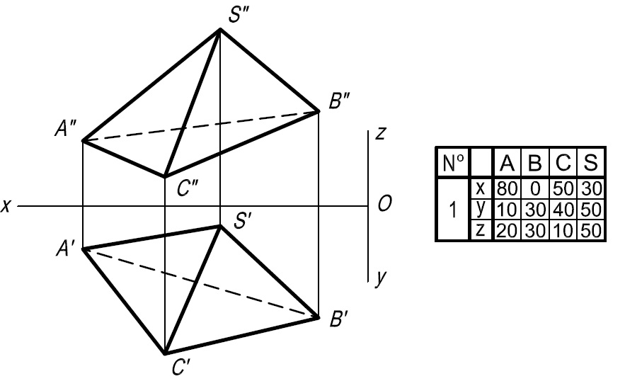 • Задача 2. Построить проекции пирамиды SABC при условии, что её высота равна 80 мм, а вершина S принадлежит прямой ЕР. Решить без преобразования чертежа.