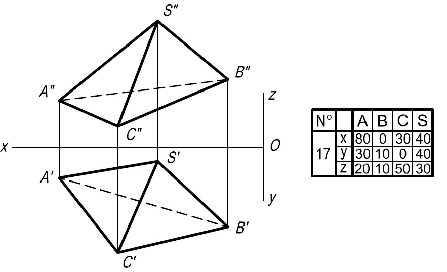 • Задача 2. Построить проекции пирамиды SABC при условии, что её высота равна 80 мм, а вершина S принадлежит прямой ЕР. Решить без преобразования чертежа.