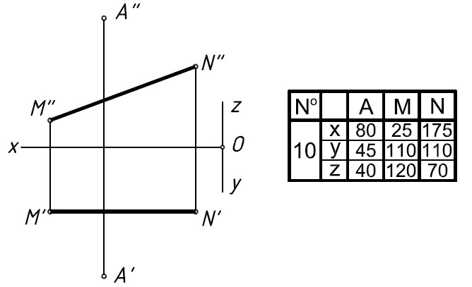 • Задача 1. Построить проекции равностороннего треугольника АВС со стороной ВС на прямой MN. Определить углы наклона высоты и плоскости треугольника к плоскостям проекций.