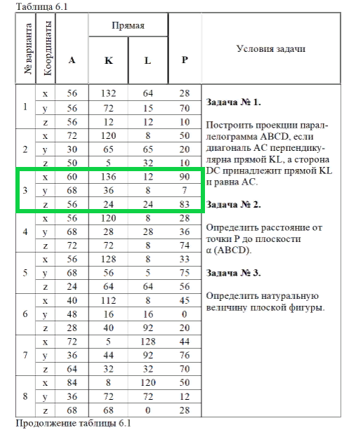 Особое внимание следует обратить на то, что вид плоского много-угольника, который необходимо построить при решении задачи № 1, за-висит от номера варианта индивидуального задания. Виды плоских многоугольников определяются номерами варианта индивидуального задания: Варианты заданий 1 ÷ 8. Построить проекции параллелограмма ABCD, если диагональ AC перпендикулярна прямой KL, а сторона DC принадлежит прямой KL и равна AC. Варианты заданий 9 ÷ 16. Построить проекции квадрата ABCD, если его диагональ BD принадлежит прямой KL..