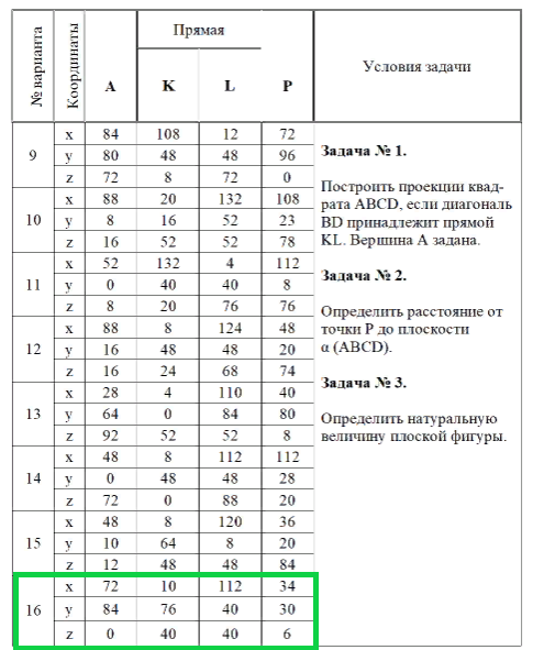 Работа включает в себя метрические, позиционные и конструктивные задачи, связанные с построением проекций геометрических фигур, отвечающих заданным условиям. Каждому обучающемуся необходимо выполнить следующие три задачи: