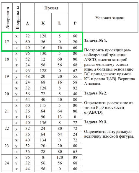Комментарии: Варианты заданий 17-24. Построить проекции равнобочной трапеции ABCD, высота которой равна меньшему основанию, а большее основание DC принадлежит прямой KL и равно 3AB
