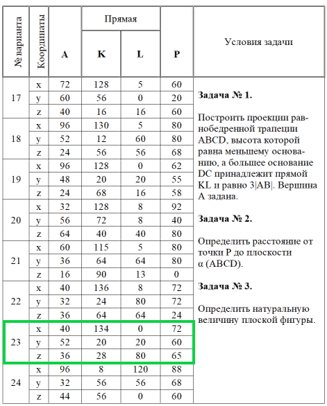 Комментарии: Варианты заданий 17-24. Построить проекции равнобочной трапеции ABCD, высота которой равна меньшему основанию, а большее основание DC принадлежит прямой KL и равно 3AB