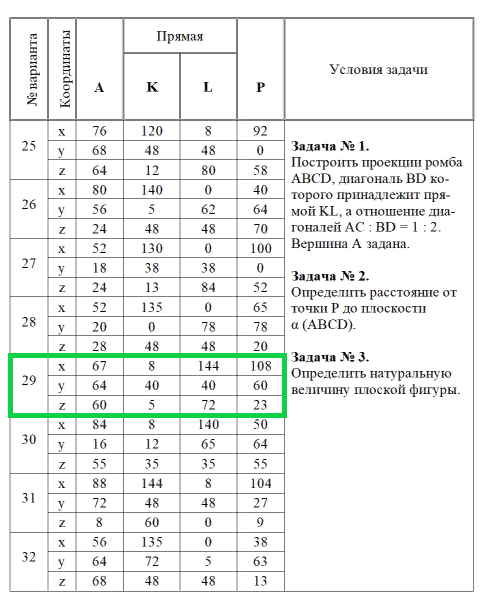 Комментарии: Варианты заданий 25-32. Построить проекции ромба ABCD, диагональ BD которого принадлежит прямой KL, а отношение диагоналей AC : BD = 1 : 2.