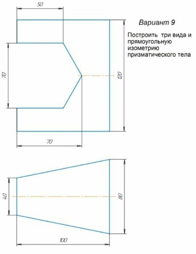 Построить три вида и прямоугольную изометрию призматического тела
