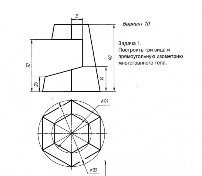 Построить три вида и прямоугольную изометрию многогранного тела