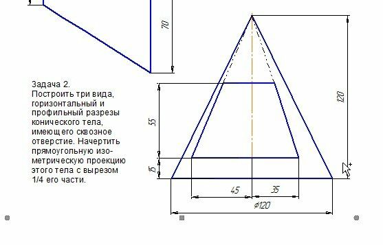 Построить три вида, горизонтальный и профильный разрезы конического тела, имеющего сквозное отверстие. Начертить прямоугольную изометрическую проекцию этого тела с вырезом 1/4 его части