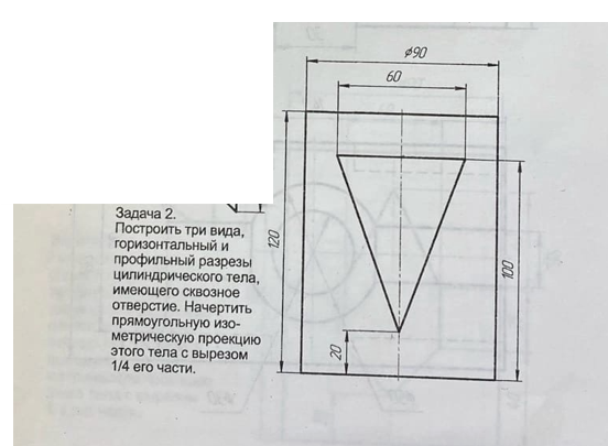 Построить три вида, горизонтальный и профильный разрезы цилиндрического тела, имеющего сквозное отверстие. Начертить прямоугольную изометрическую проекцию этого тела с вырезом 1/4 его части