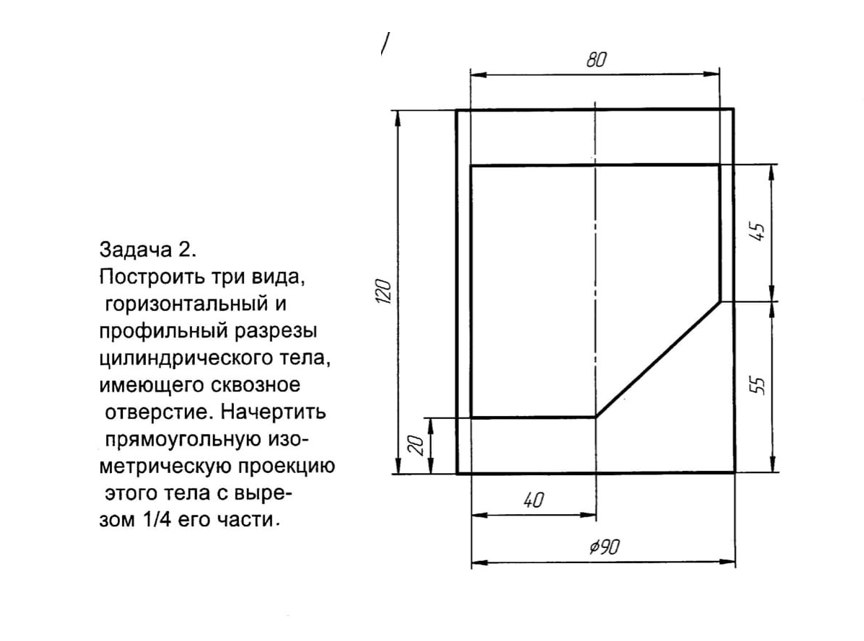Построить три вида, горизонтальный и профильный разрезы цилиндрического тела, имеющего сквозное отверстие. Начертить прямоугольную изометрическую проекцию этого тела с вырезом 1/4 его части