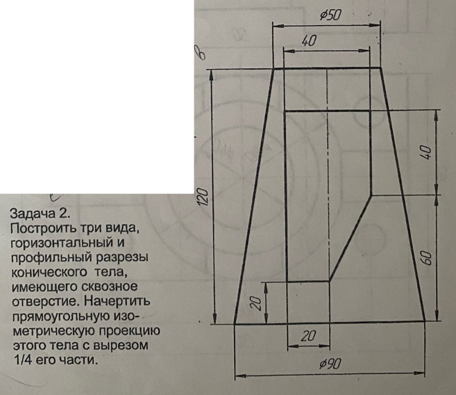 Построить три вида, горизонтальный и профильный разрезы конического тела, имеющего сквозное отверстие. Начертить прямоугольную изометрическую проекцию этого тела с вырезом 1/4 его части