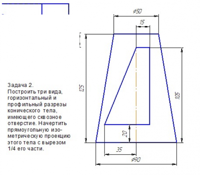 Построить три вида, горизонтальный и профильный разрезы конического тела, имеющего сквозное отверстие. Начертить прямоугольную изометрическую проекцию этого тела с вырезом 1/4 его части
