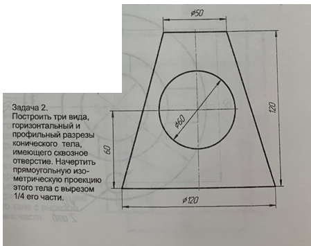 Построить три вида, горизонтальный и профильный разрезы конического тела, имеющего сквозное отверстие. Начертить прямоугольную изометрическую проекцию этого тела с вырезом 1/4 его части