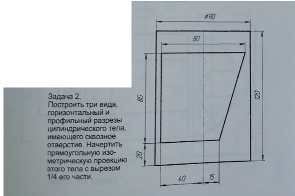 Построить три вида, горизонтальный и профильный разрезы цилиндрического тела, имеющего сквозное отверстие. Начертить прямоугольную изометрическую проекцию этого тела с вырезом 1/4 его части