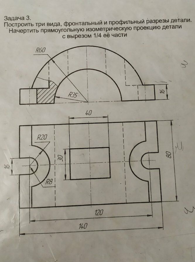 Построить три вида, фронтальный и профильный разрезы детали. Начертить прямоугольную изометрическую проекцию детали с вырезом 1/4