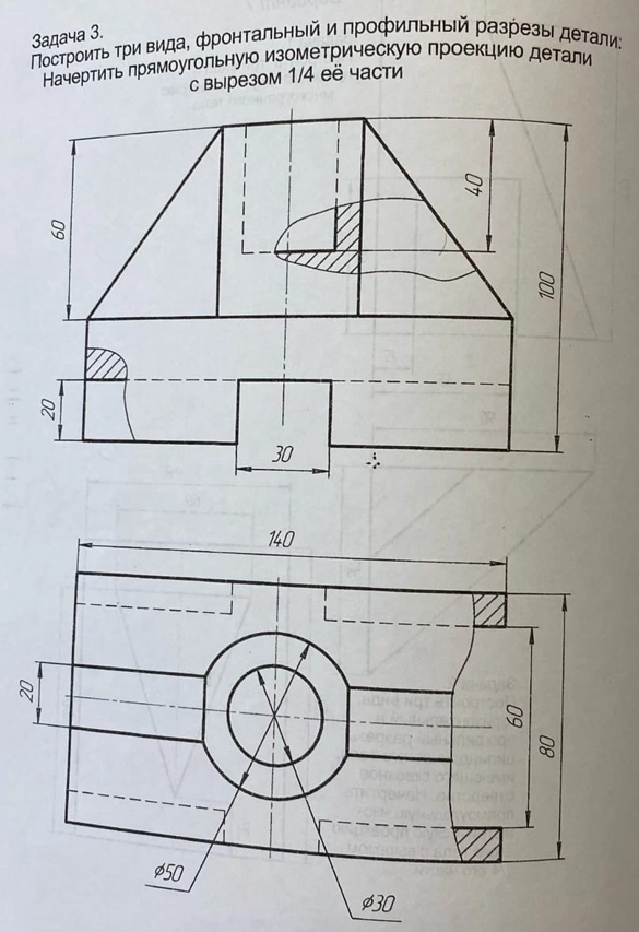 Построить три вида, фронтальный и профильный разрезы детали. Начертить прямоугольную изометрическую проекцию детали с вырезом 1/4