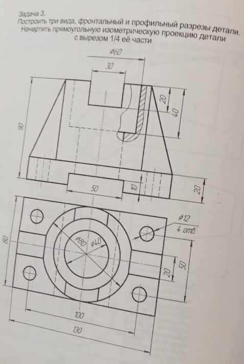 Построить три вида, фронтальный и профильный разрезы детали. Начертить прямоугольную изометрическую проекцию детали с вырезом 1/4 её части