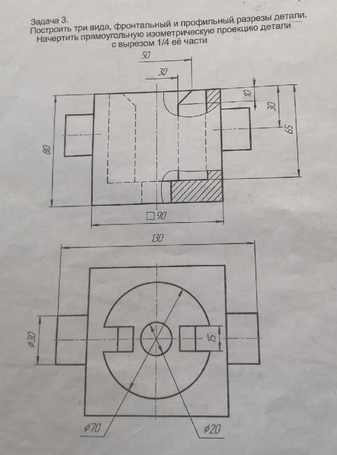 Построить три вида, фронтальный и профильный разрезы детали. Начертить прямоугольную изометрическую проекцию детали с вырезом 1/4