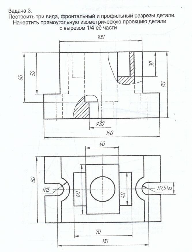 Построить три вида, фронтальный и профильный разрезы детали. Начертить прямоугольную изометрическую проекцию детали с вырезом 1/4 её части Формат файла: