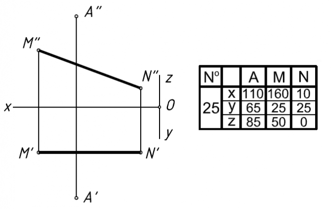 • Задача 1. Построить проекции равностороннего треугольника АВС со стороной ВС на прямой MN. Определить углы наклона высоты и плоскости треугольника к плоскостям проекций.