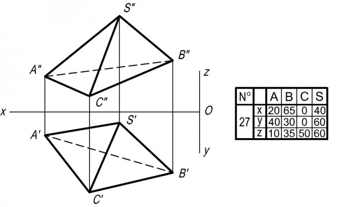 • Задача 3. Дана пирамида SABC. Определить, применяя способы преобразования чертежа: