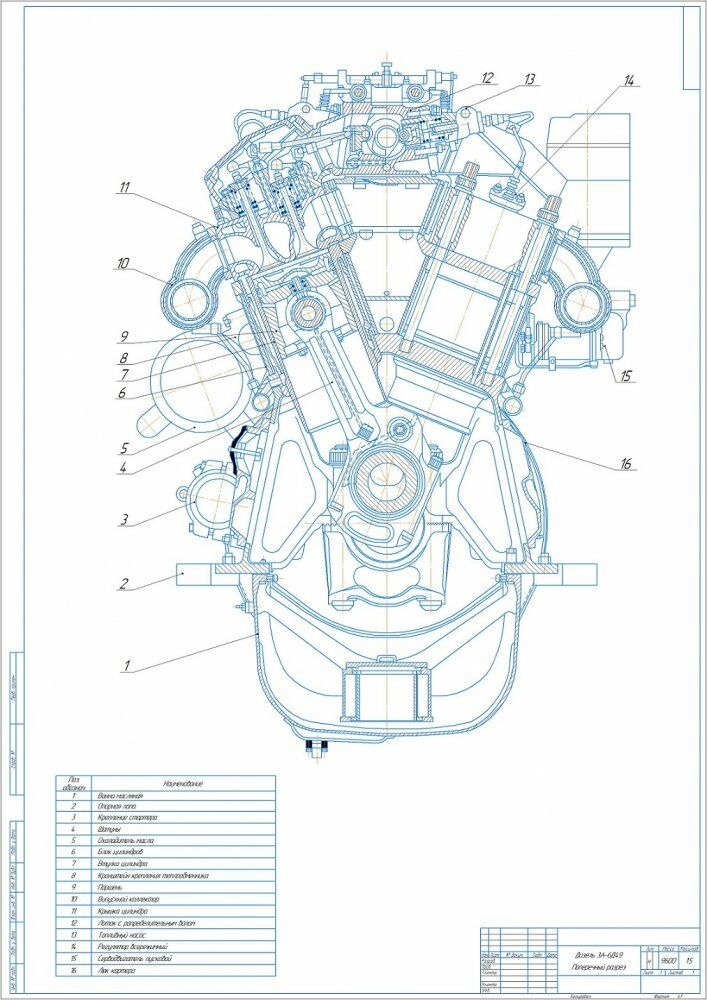 Задача: Дизель 3А-6Д49. Поперечный разрез. Чертеж.