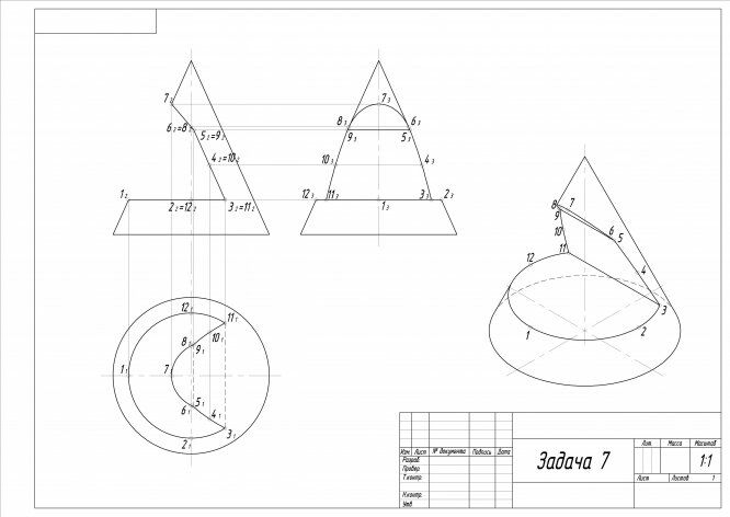 Задача 7. Вариант 3. СЕЧЕНИЕ ПОВЕРХНОСТЕЙ ПРОЕЦИРУЮЩЕЙ ПЛОСКОСТЬЮ.