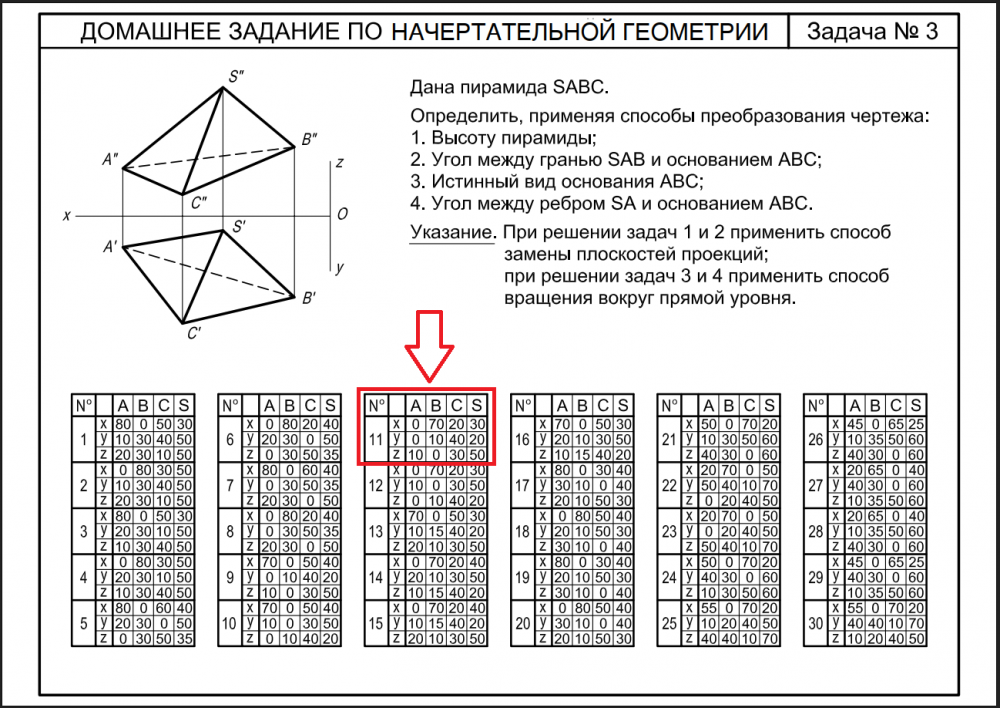 Дана пирамида SABC. Определить, применяя способы преобразования чертежа: 1. Высоты пирамида; 2. Угол между гранью SAB и основанием ABC; 3. Истинный вид основания ABC; 4. Угол между ребром SA и основанием ABC..